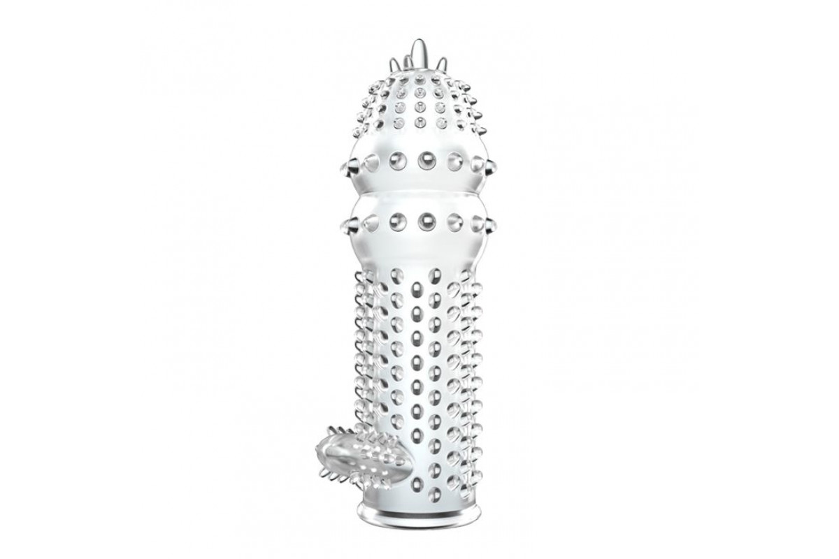 Прозрачная насадка на пенис с шипами и стимулятором клитора - 12,8 см.