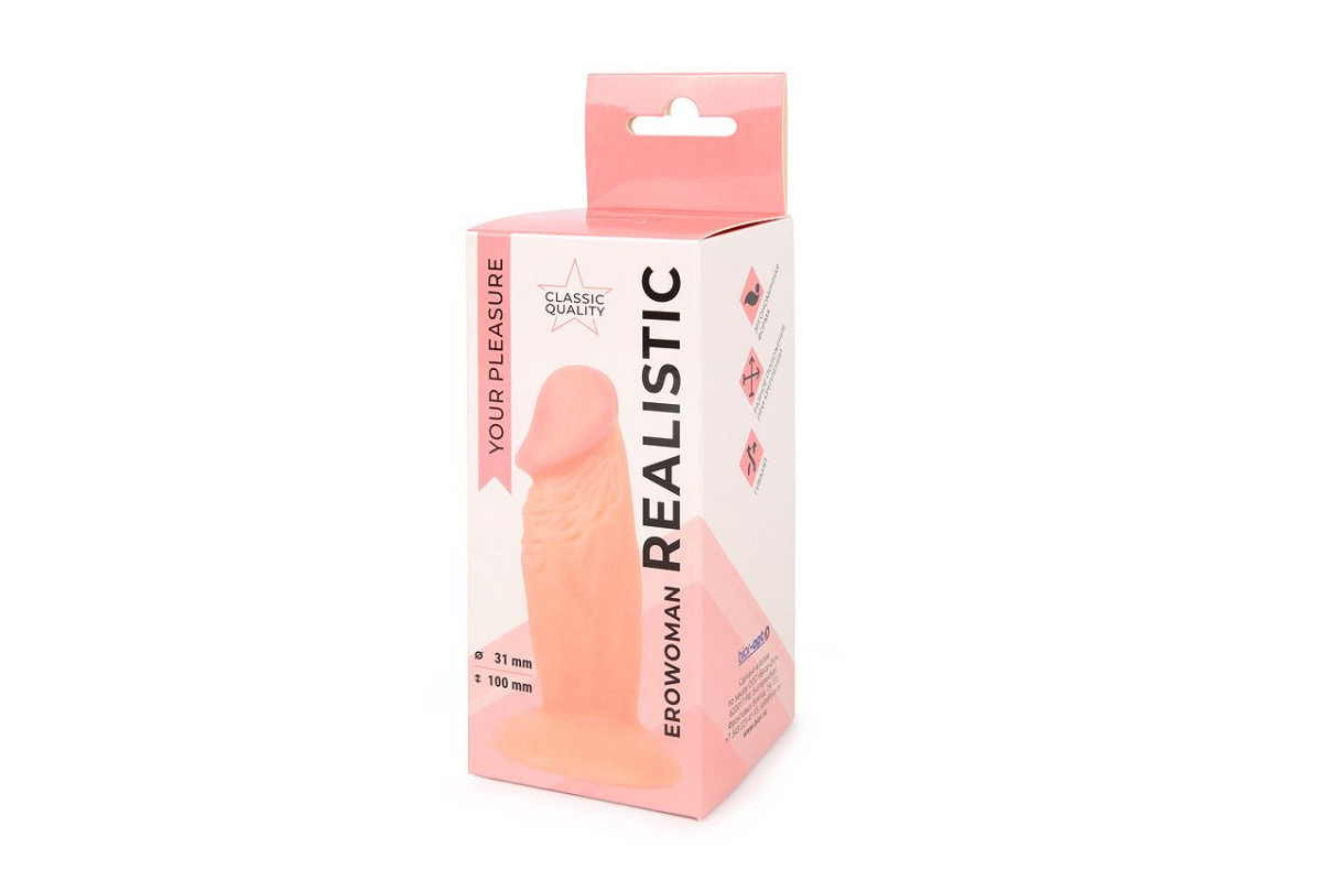 Великолепный фаллоимитатор-реалистик Erowoman займёт достойное место в любой коллекции секс-игрушек! К основным плюсам изделия можно отнести прекрасное качество исполнения; точную имитацию всех деталей - чётко выраженная головка и мошонка, хорошо прорисованные венки и складочки; естественный оттенок поверхности; прочную присоску, позволяющую закрепить интимный аксессуар на ровной поверхности в горизонтальном или вертикальном положении. Фаллоимитатор изготовлен из мягкого материала, дарящего приятные тактильные ощущения. Прост в использовании и уходе. Рабочая длина - 10 см.