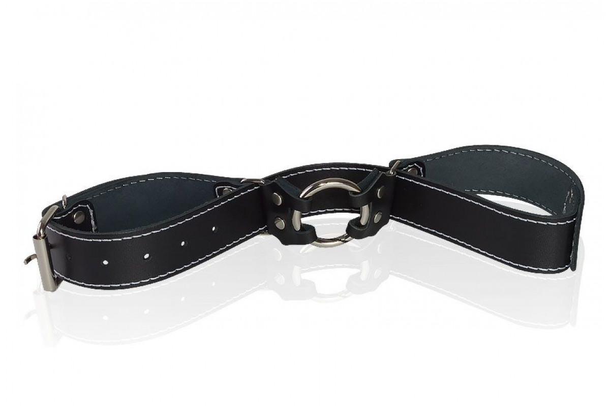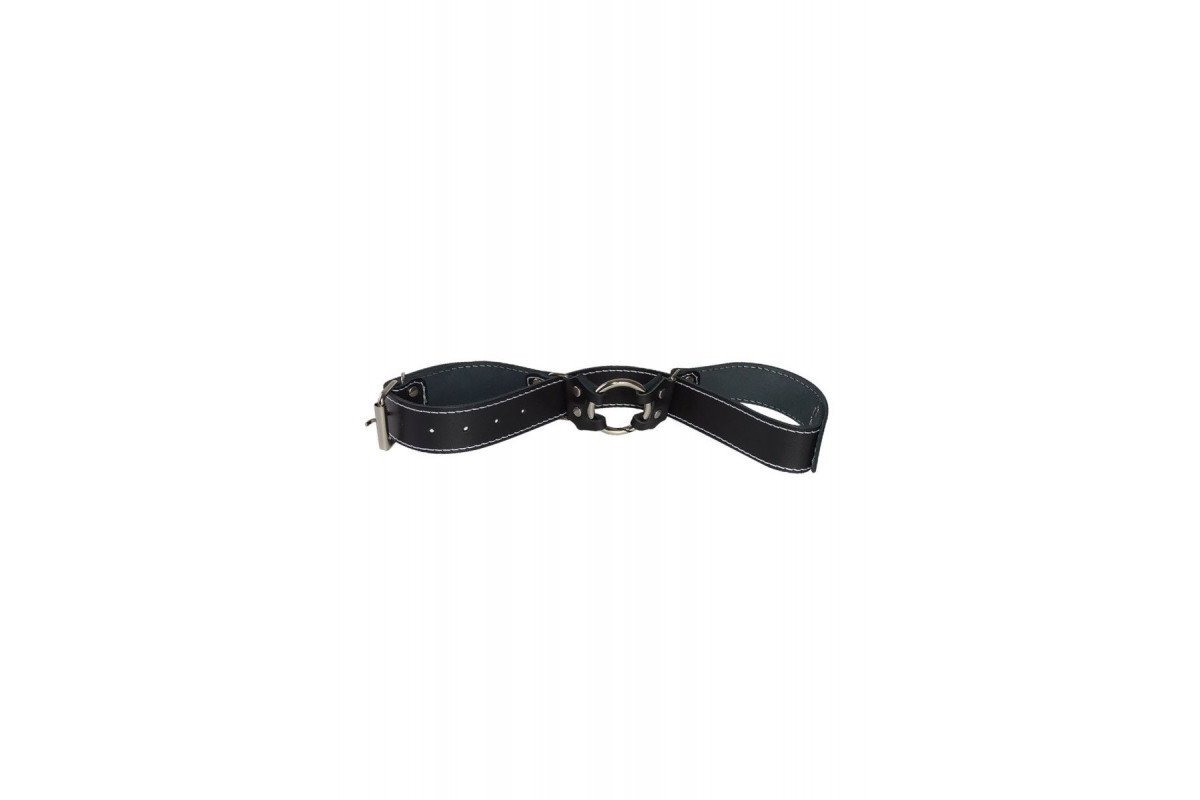 Надёжная конструкция оков в виде восьмерки очень проста и удобна в использовании. Регулировка производится с помощью пряжек. Широкий кожаный ремень с белой строчкой, большим кольцом для фиксации и готическими декоративными кожаными накладками, будут смотреться безумно эротично на секс-партнёре, что взбудоражит воображение и доставит массу ярких ощущений. Вся используемая металлическая фурнитура имеет хромированное покрытие.