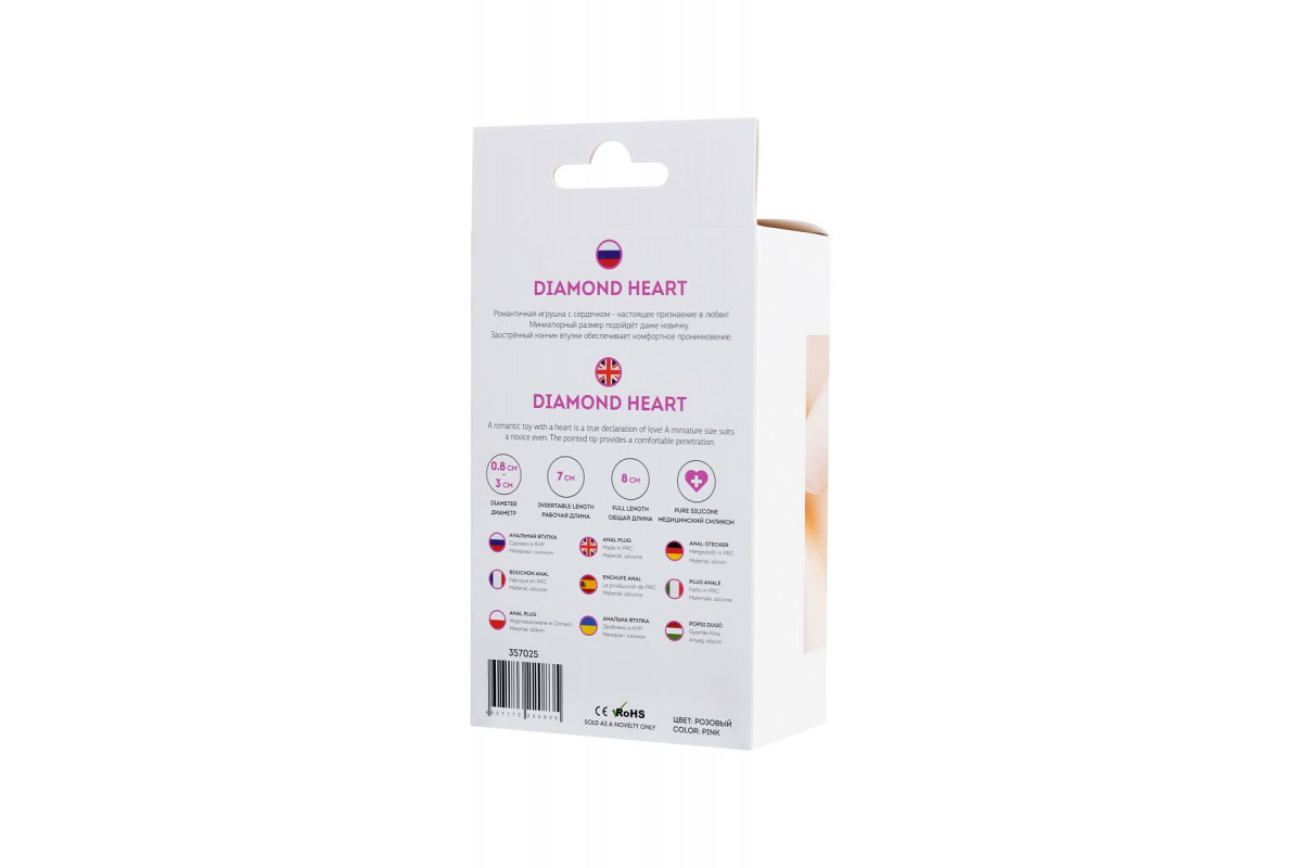 Анальная втулка Diamond Heart. Романтичная игрушка с сердечком - настоящее признание в любви! Средний размер подойдёт как новичкам, так и опытным любителям. Заострённый кончик втулки обеспечивает комфортное проникновение. Рабочая длина - 7 см.
