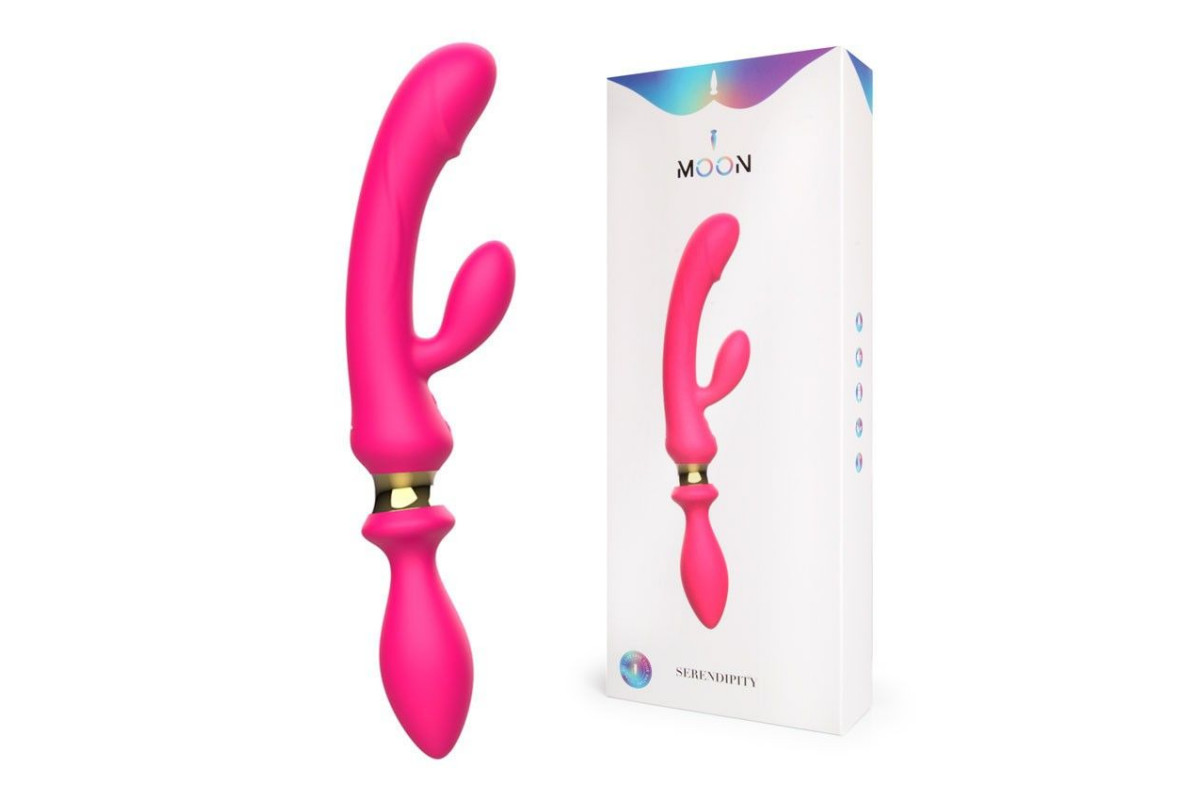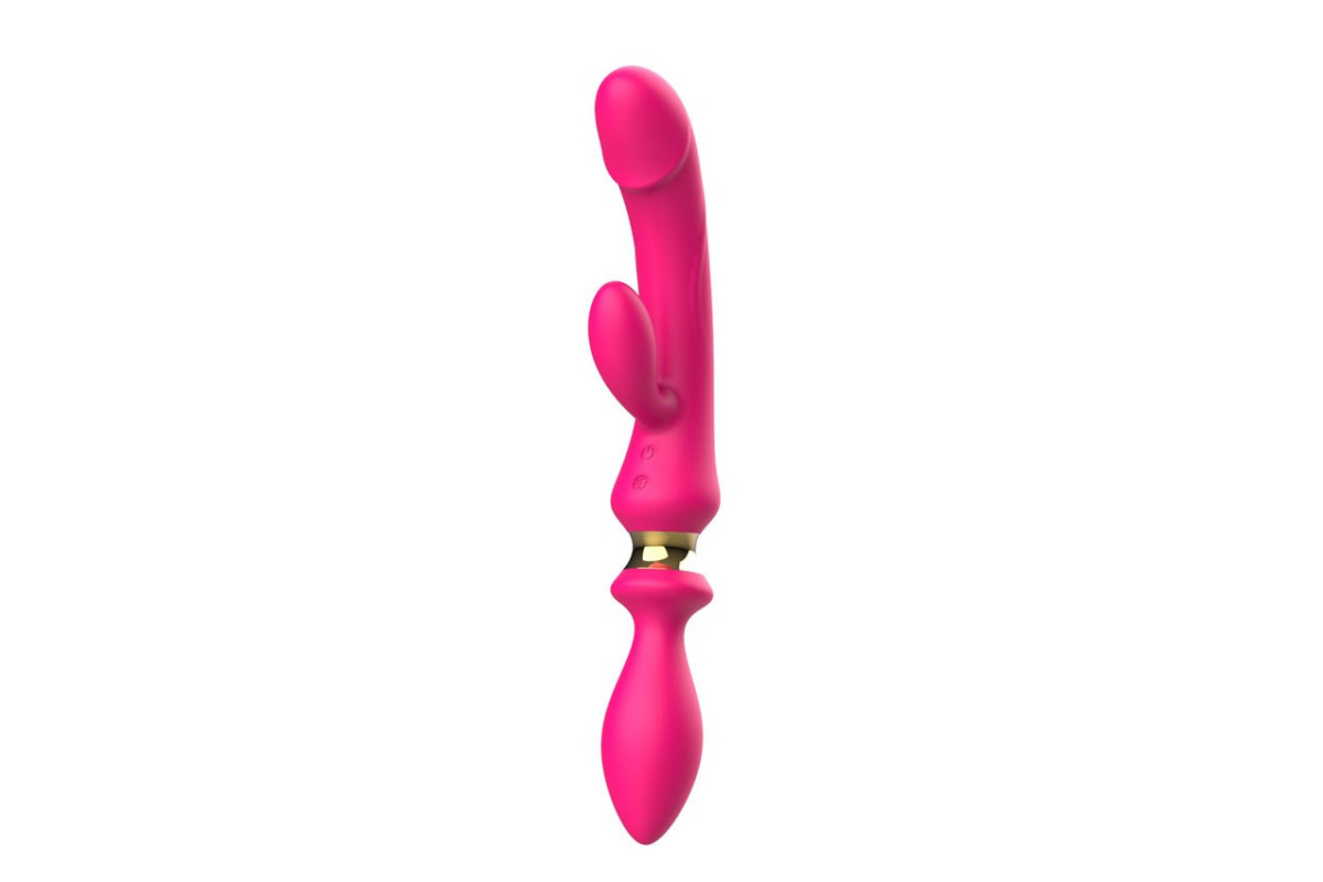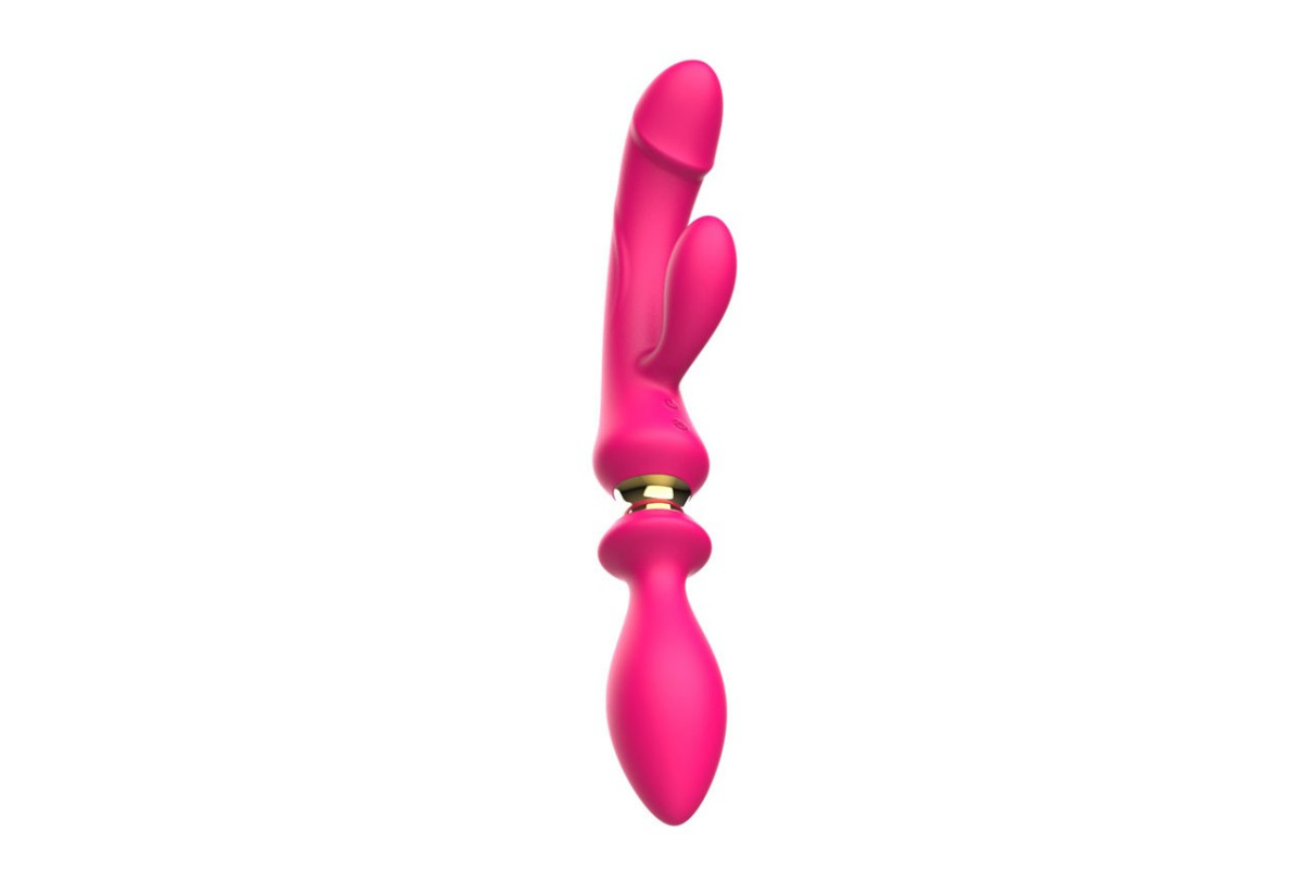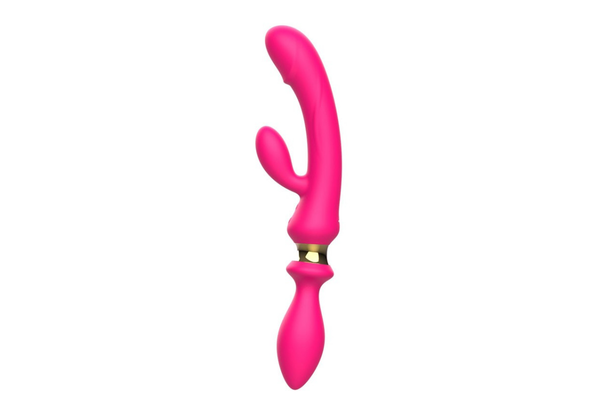 Розовый двусторонний вибромассажёр с клиторальным отростком – удовольствие без границ