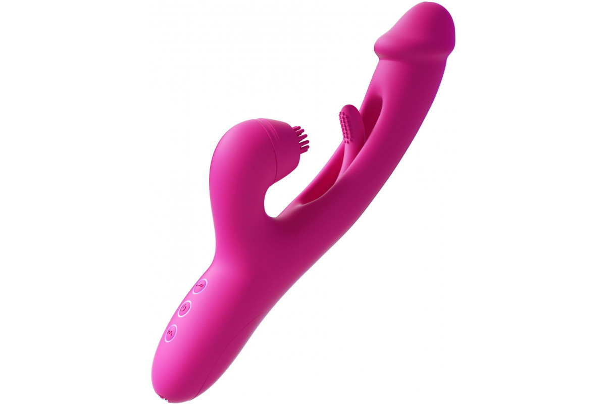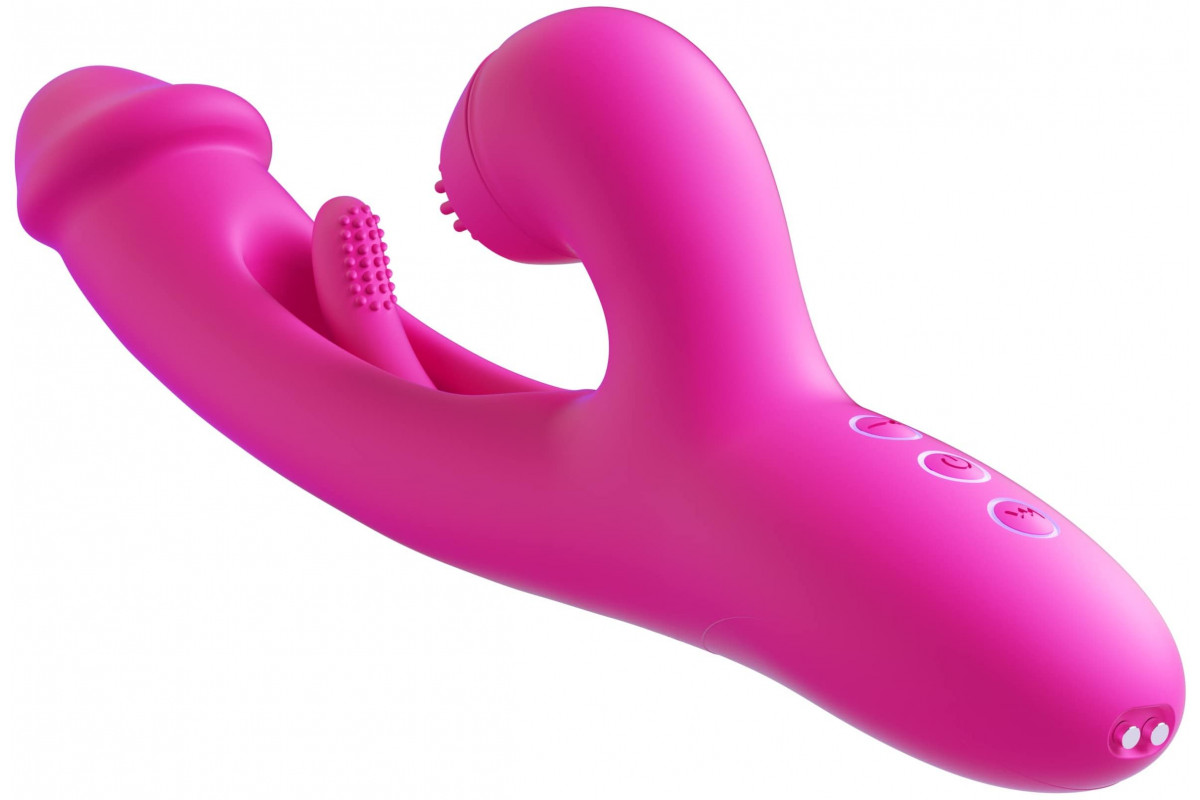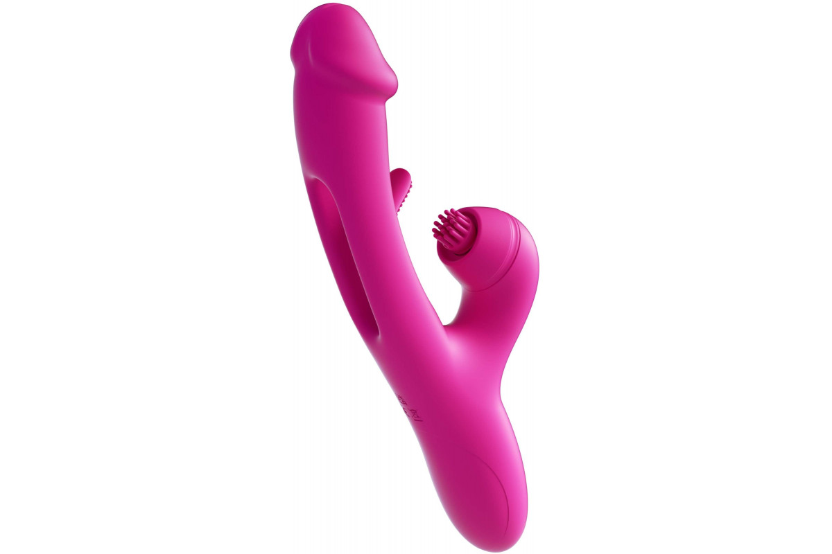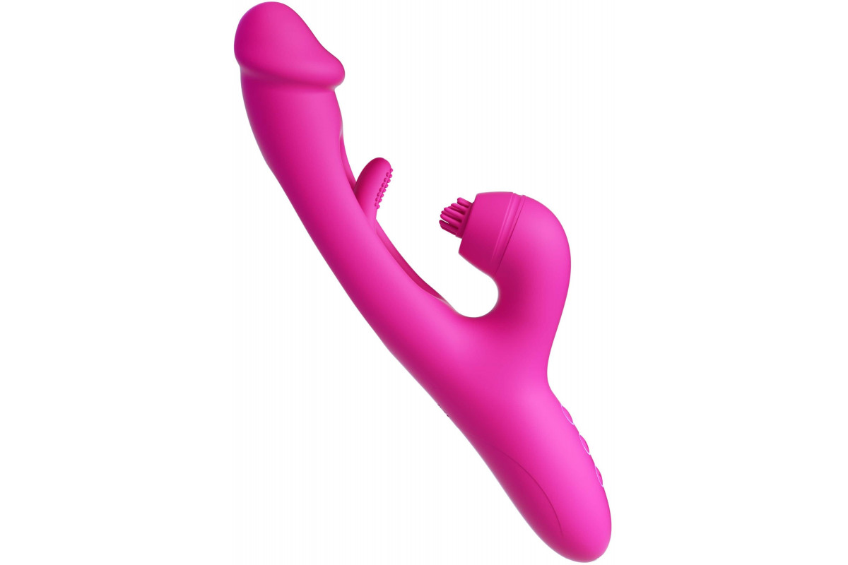 G pro Ultra - инновационный вибратор кролик с тремя мощными моторами. Эта игрушка станет идеальной для усиленной стимуляции точки G. Стимулятор имеет гибкую головку с загнутой и увеличенной формой, на самом кончике головки располагается мощный вибрационный мотор, который работает на 7 разных режимах, а в стволе игрушки есть небольшой язычок, который точечно стимулирует точку G интенсивными постукиваниями на 7 разных режимах. Клиторальная часть кролика максимально универсальна, она легко подстроится под любую анатомию, благодаря гибкому материалу. Но основная фишка — это 4 сменных насадки, которые позволят выбирать разные варианты стимуляции. Насадка с отверстием - для воздушно волновой стимуляции, насадка с плотным шариком - для постукивающей стимуляции, насадка с язычком - для точечной стимуляции, насадка с щеточками - для более мягкой стимуляции.