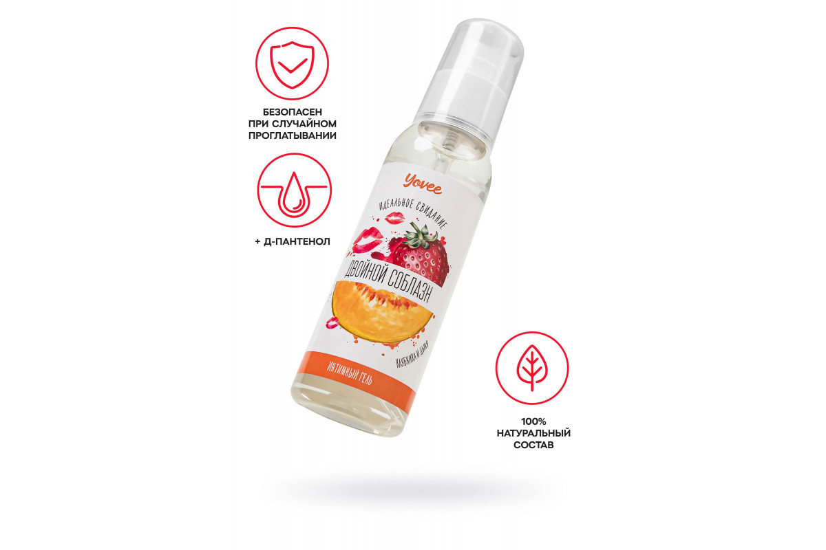 Интимный гель-смазка Yovee «Двойной соблазн» подарит комфорт и безупречное скольжение. Пантенол окажет успокаивающее и смягчающее действие, ускорит процессы регенерации слизистых. Волшебное сочетание вкусов и ароматов клубники и дыни усилят удовольствие. Подходит для использования как с презервативом, так и без него. Шелковистая текстура на водной основе обеспечивает длительное скольжение без липкости и скатывания. Легко смывается водой, не оставляет следов на одежде и постельном белье. Простой и безопасный состав: безопасен при случайном проглатывании, безопасен для микрофлоры.