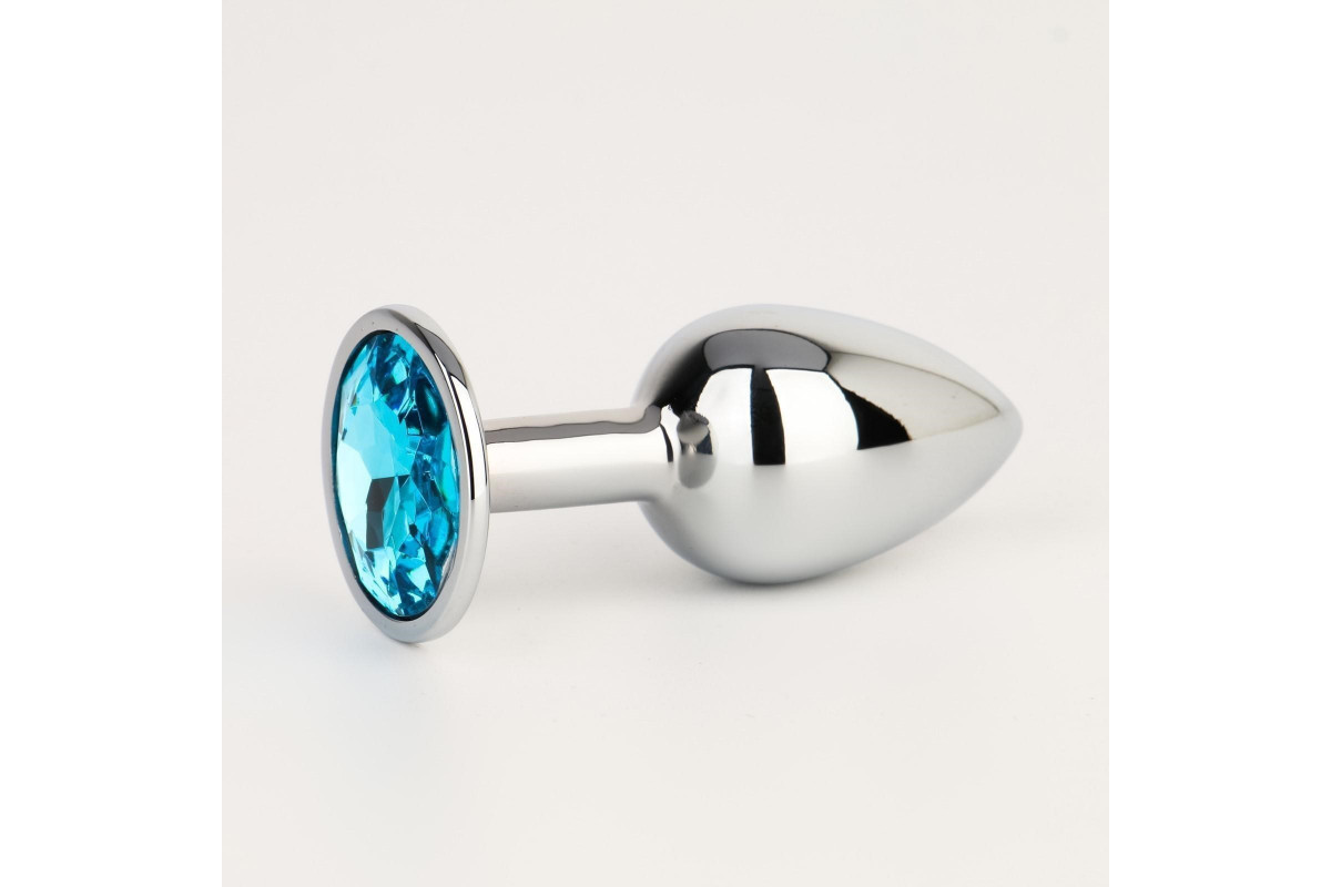 Серебристая анальная втулочка с голубым кристаллом - 7 см.