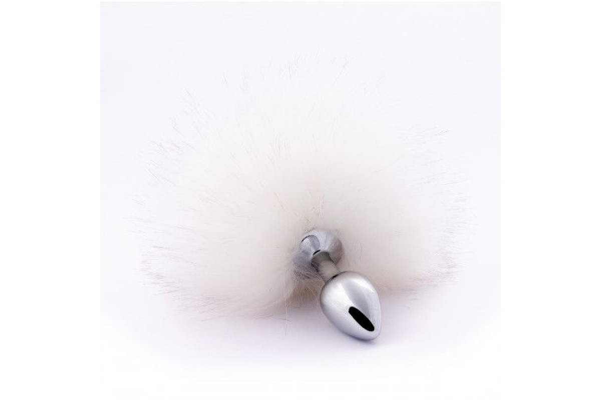 Серебристая анальная пробка с белым хвостиком. Искусственный эко-мех. Диаметр хвоста — 15 см.