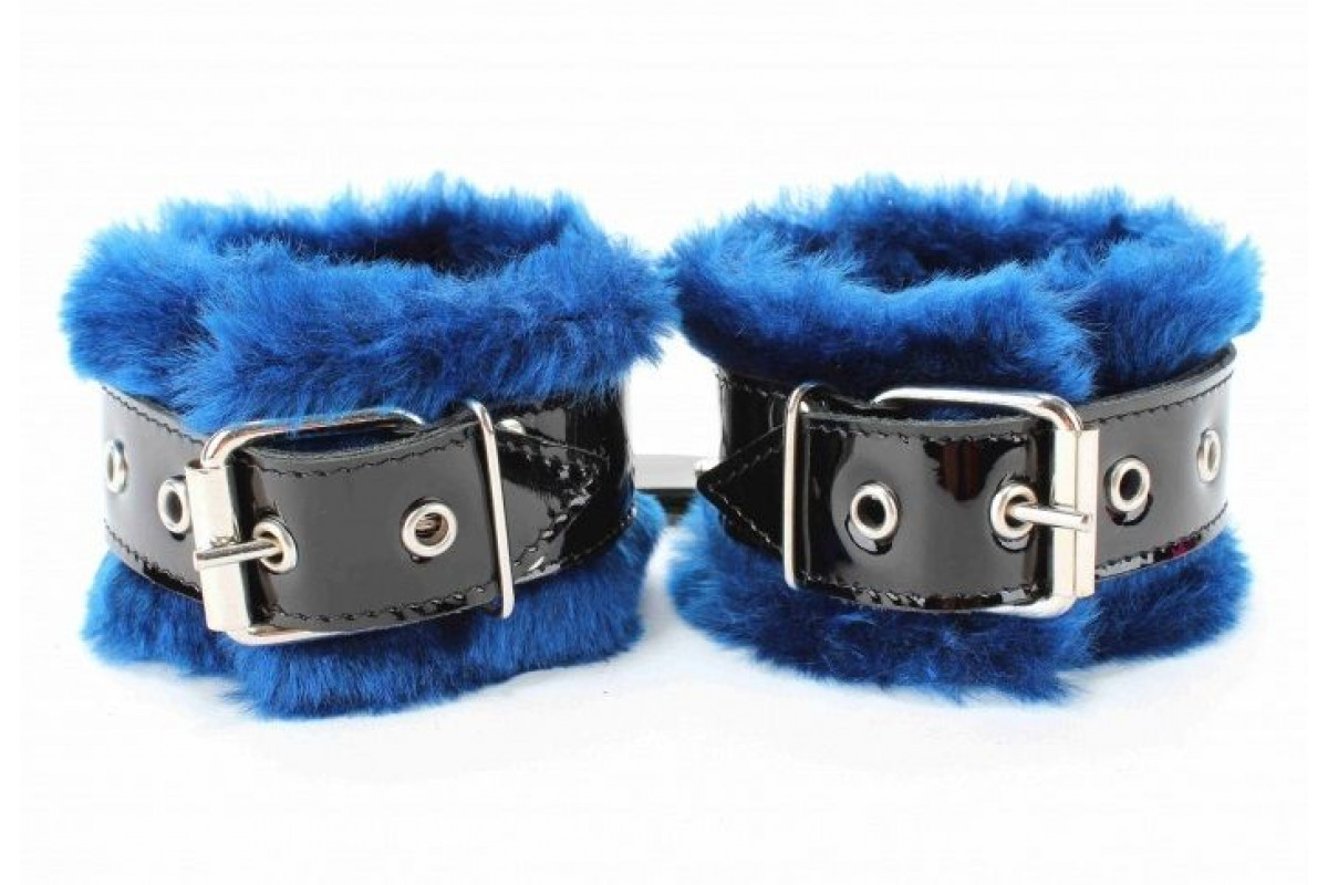 Элегантные синие меховые наручники с ремешками из лакированной кожи