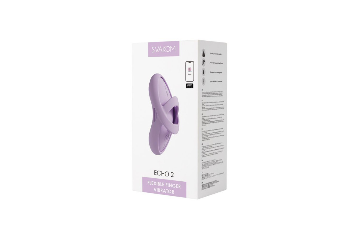 Сиреневый вибромассажёр на пальцы Echo 2 с функцией нагрева — идеальный аксессуар для тех, кто ищет новые ощущения и максимальный комфорт в моменты расслабления. Благодаря инновационной технологии нагрева, этот массажёр подарит невероятно приятные и тёплые прикосновения, усиливая наслаждение от каждого использования.