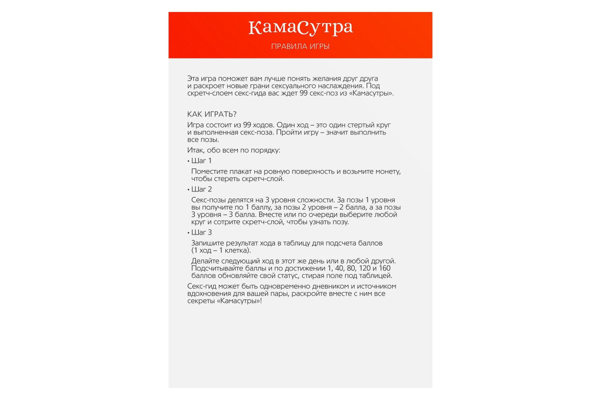 Пройти игру - значит выполнить все позы. Итак, обо всём по порядку: для начала поместите плакат на ровную поверхность и возьмите монету, чтобы стереть скретч-слой. В комплекте: плакат формата А3 со скретч-слоем,правила игры.