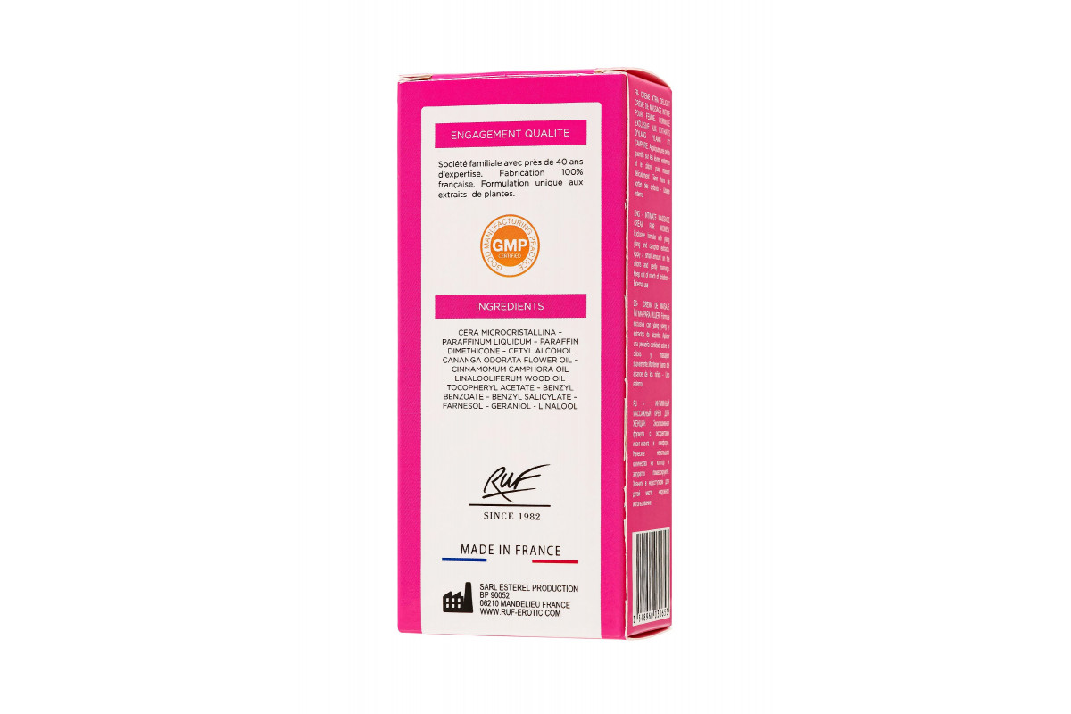 - Состав: Cera microcristallina, Paraffinum liquidum, Paraffin dimethicone, Cetyl alcohol, Cananga odorata flower oil, Cinnamomum camphora oil, Linalooliferum wood oil, Tocopheryl acetate, Benzyl benzoate, Benzyl salicylate, Farnesol, Geraniol, Linalool