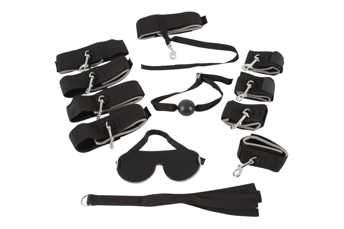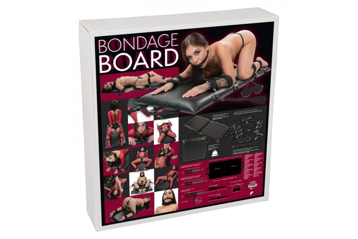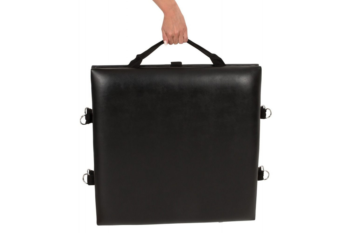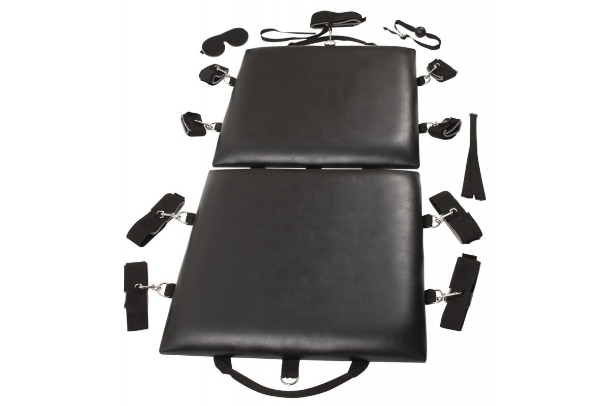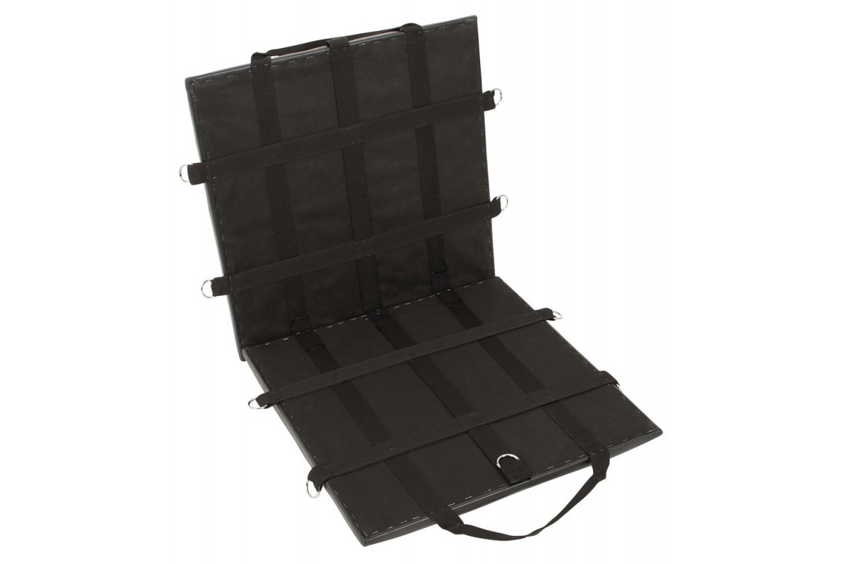 Переносная доска для связывания с плечевым ремнем. Для всех пар, которые хотят наслаждаться своими фетиш-фантазиями где угодно. В комплекте: складная доска с ремнем для переноски и набором для фиксации и ограничения, 4 манжеты для рук и ног, 1 шейный ремень с карабиновыми крючками, маска для глаз, кляп-шарик, ремни для фиксации. Длина стола в собранном виде – 60 см., ширина – 60 см.