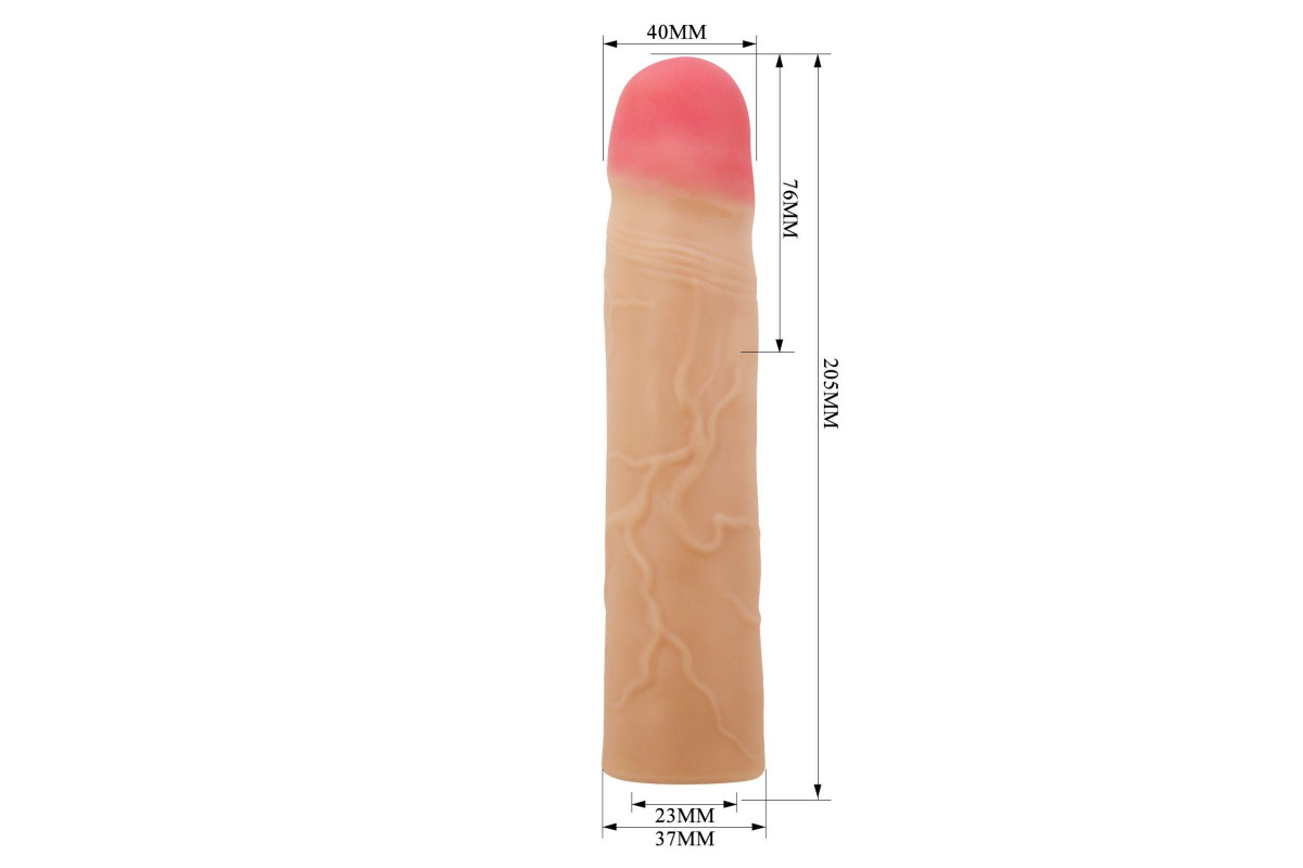 Насадка обладает мягкой и приятной на ощупь текстурой, которая обеспечивает максимально естественные ощущения. Ее телесный оттенок делает использование незаметным и естественным, а длина 20,5 см позволяет экспериментировать с разными техниками и позициями.