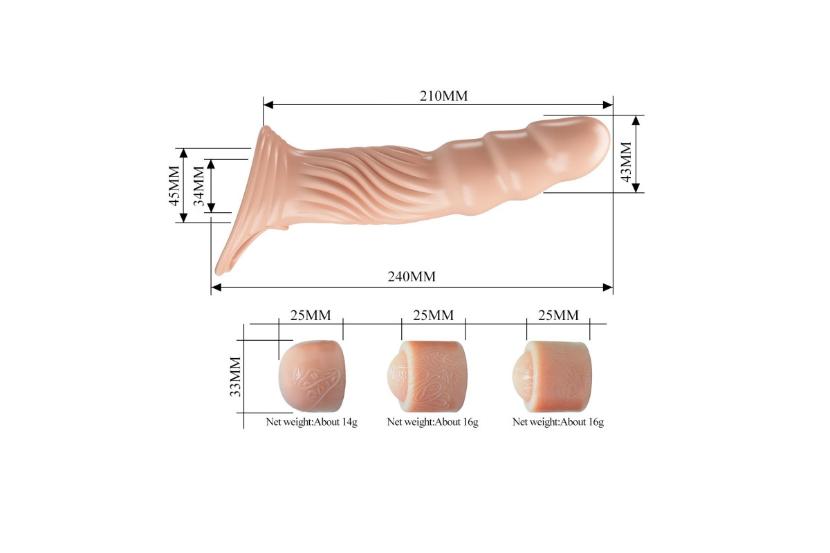 Какие точные размеры у товара Телесная насадка на пенис с тремя вкладышами-удлинителями - 24 см. и кому он подойдёт?