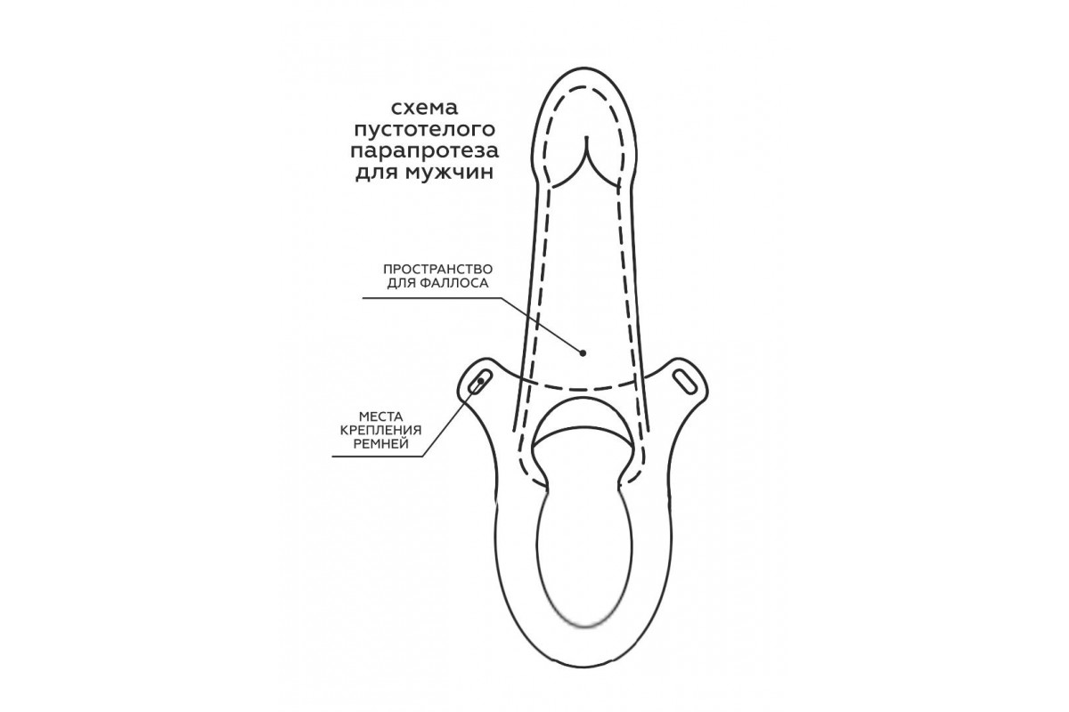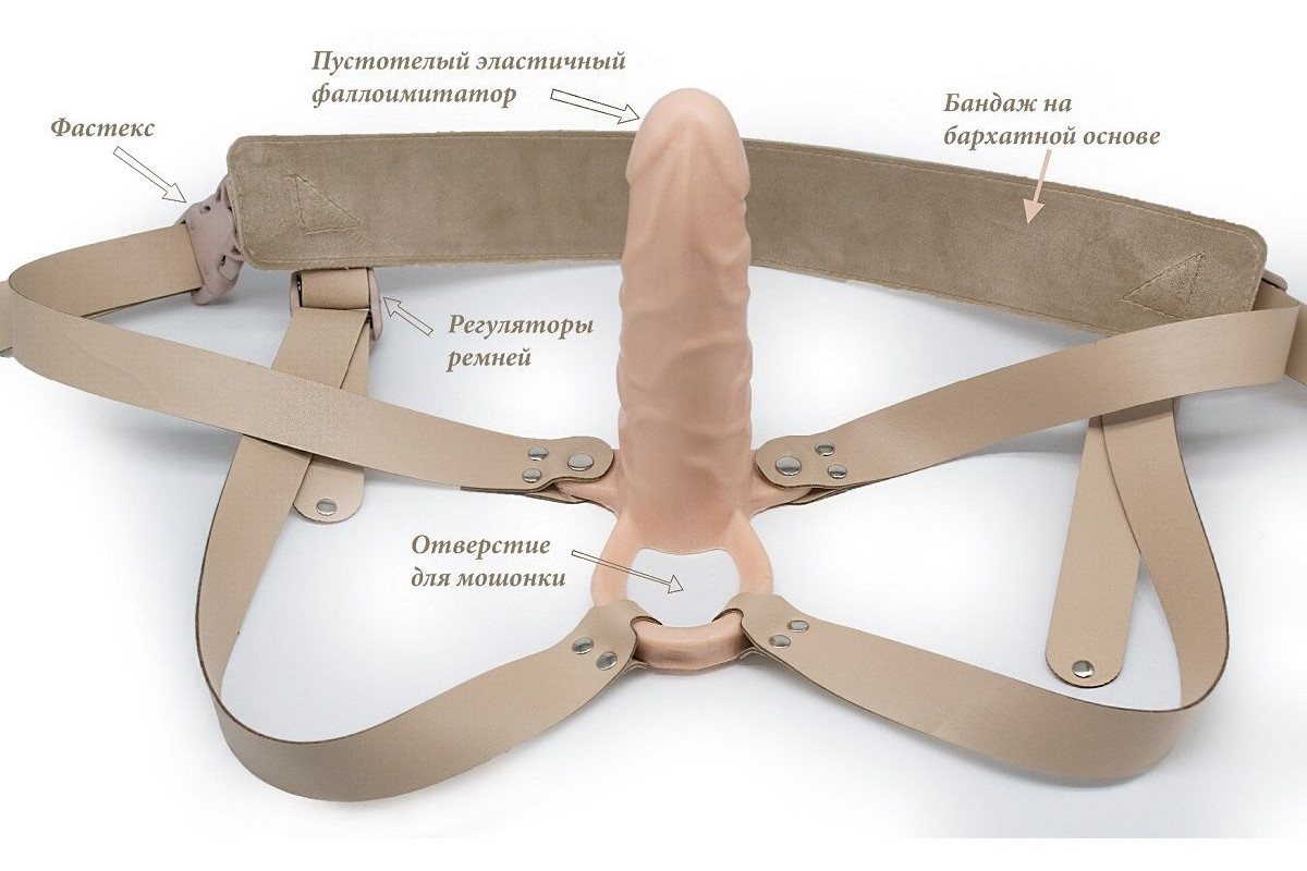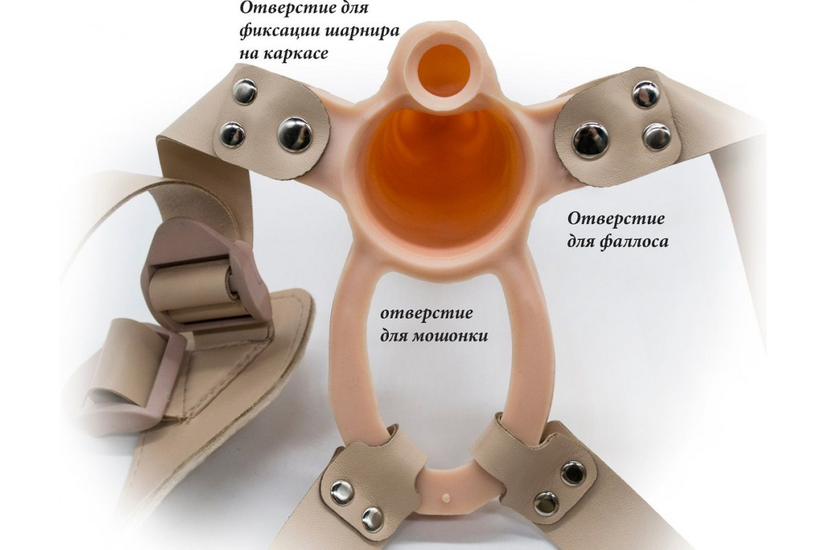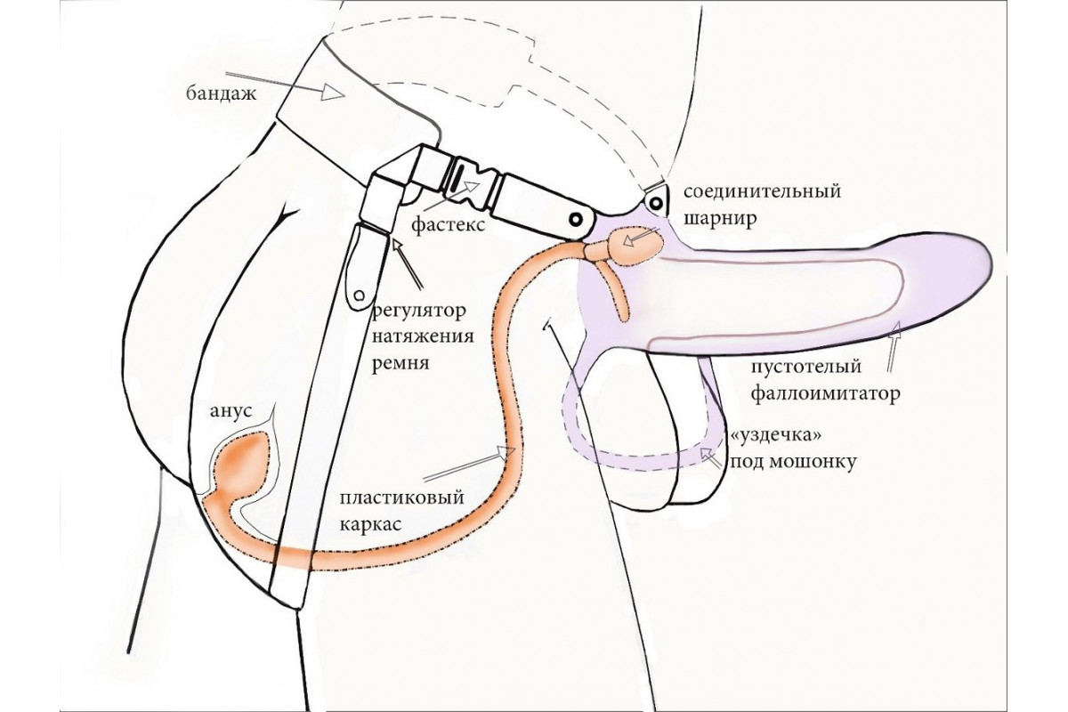 Введение полового члена возможно обеспечить в пустом эластичном каркасе. Эта основная идея, заложенная конструкторами. Каркас зафиксирован на поясе. Главное в этом изделии: для дополнительной стимуляции предстательной железы, что повышает вероятность стойкой эрекции, в этой конструкции предусмотрена дополнительная точка крепления за анус.