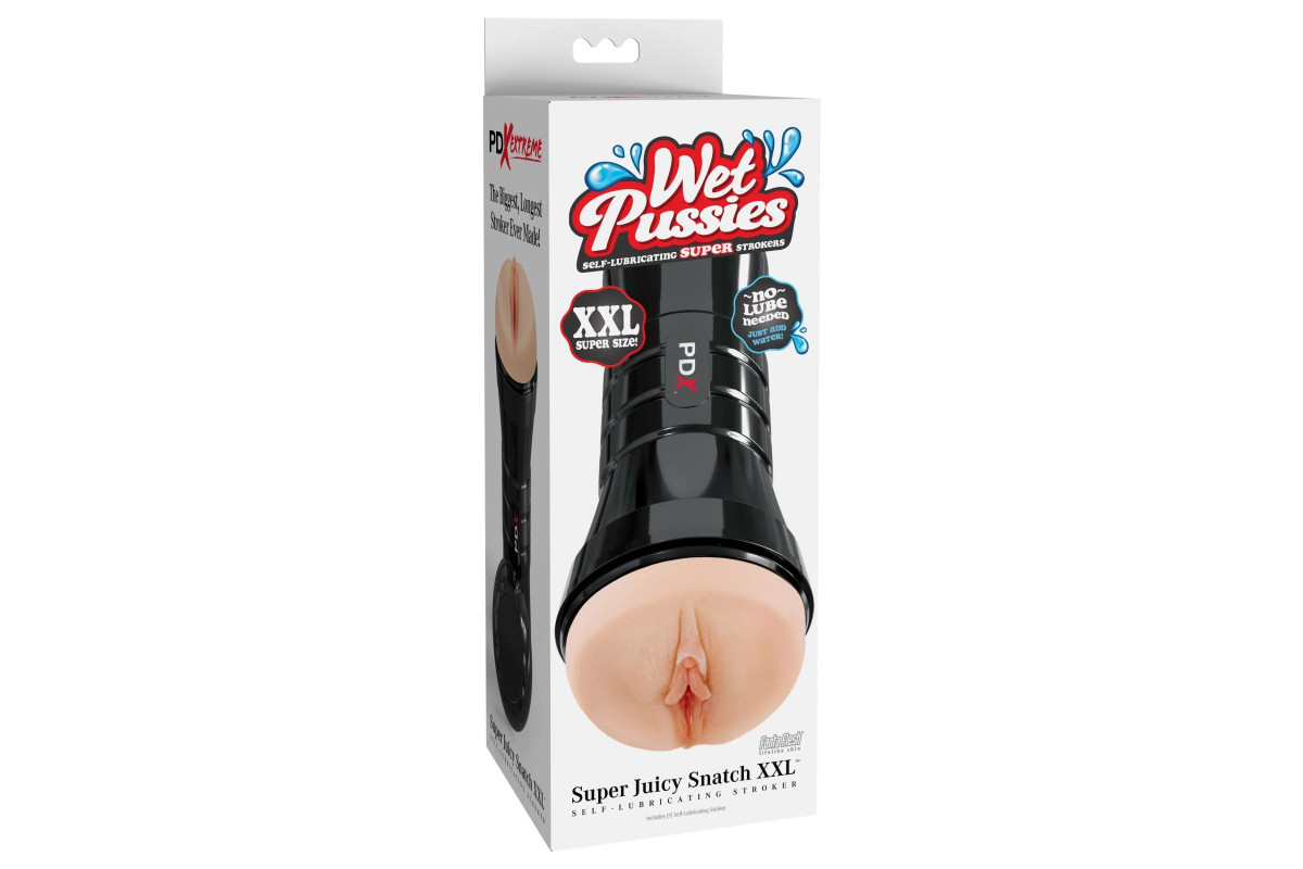 Телесный мастурбатор-вагина в черной колбе Super Juicy Snatch XXL — максимально реалистичный опыт для взрослых