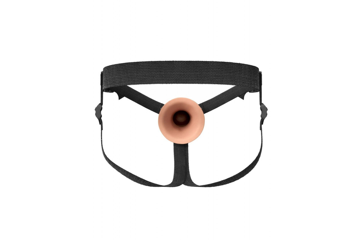 Телесный полый страпон на черных ремнях Hollow Silicone Strap-on - 17,8 см.