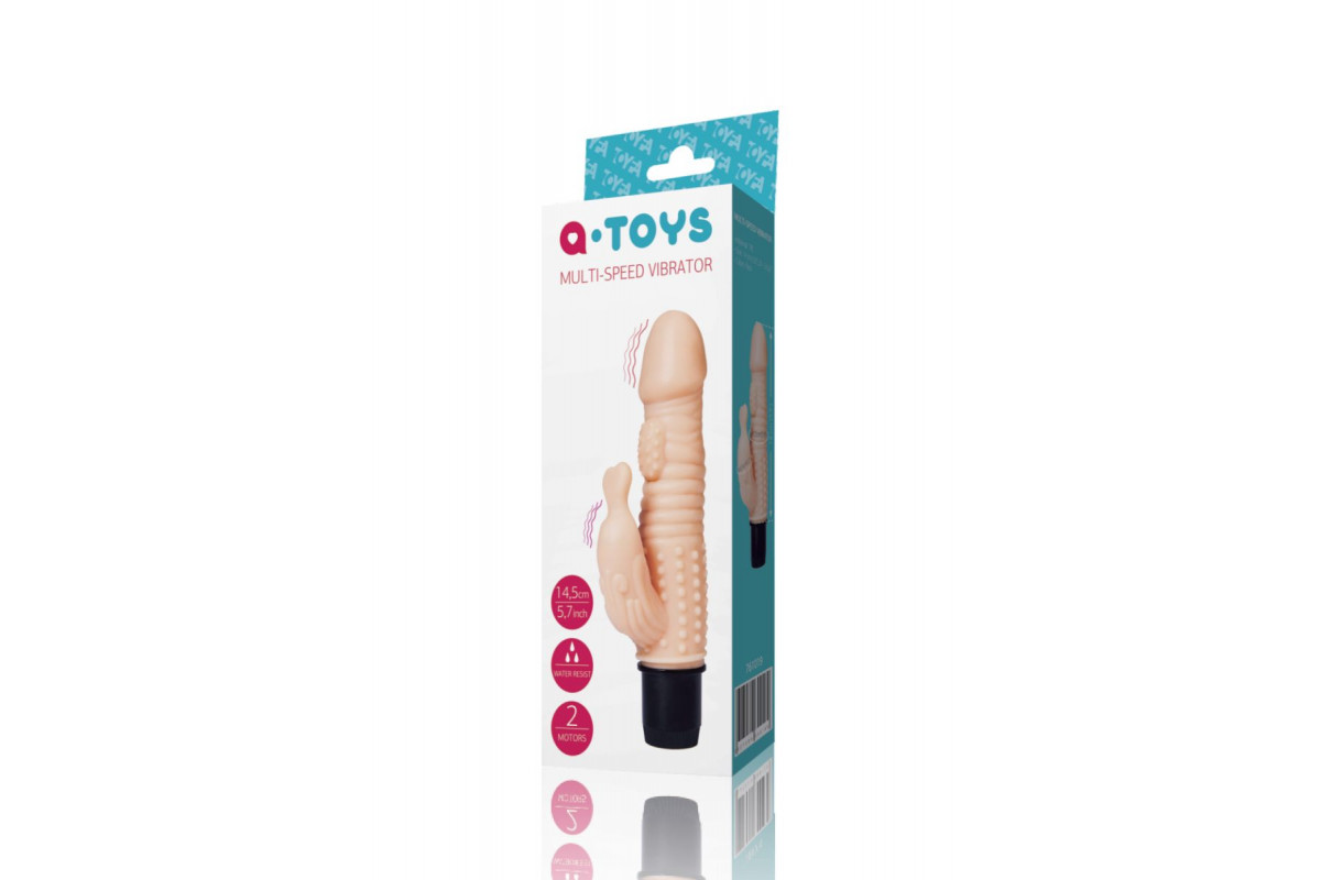 Телесный вибратор с дополнительным рельефом и клиторальным отростком — 16 см