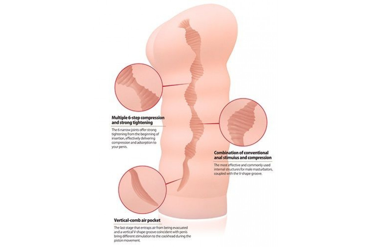 Отверстие с 6 узкими перемычками идеально имитирует анальное отверстие. Она дает ощущения очень тесного сжатия и вакуума. Шесть плотных колец TONG GGO эффективно стимулируют пенис, а виброрпуля придаёт дополнительную стимуляцию. Этот мастурбатор можно назвать самым популярным среди всех мастурбаторов, имитирующих анальный секс - за счет своей ультра-реалистичной внутренней структуры с упругими перемычками и V-образными ребрышками.