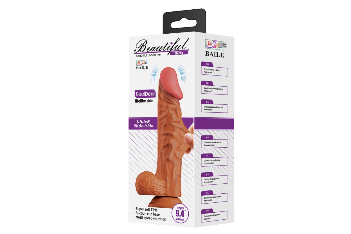 Какие точные размеры у товара Темно-бежевый вибратор с эффектом скользящей кожи Buraq - 24 см. и кому он подойдёт?