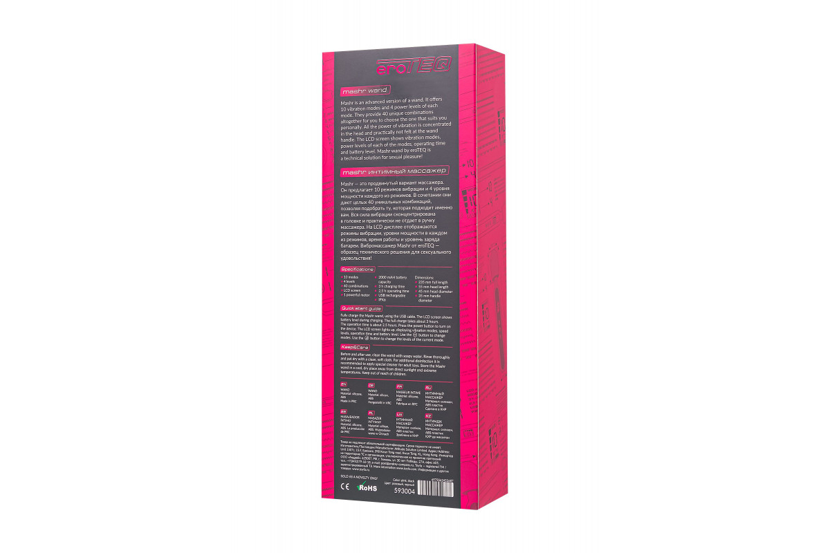 Впечатляйтесь функционалом игрушки даже в душе, благодаря водонепроницаемой технологии IPX6, обеспечивающей простоту в уходе. Рекомендуется использовать лубрикант на водной основе. С Mashr вы не просто получаете вибромассажер. Вы обретаете ключ к новым высотам наслаждения и удовлетворения. Покорите путь к безграничному удовольствию с Mashr от eroTEQ!