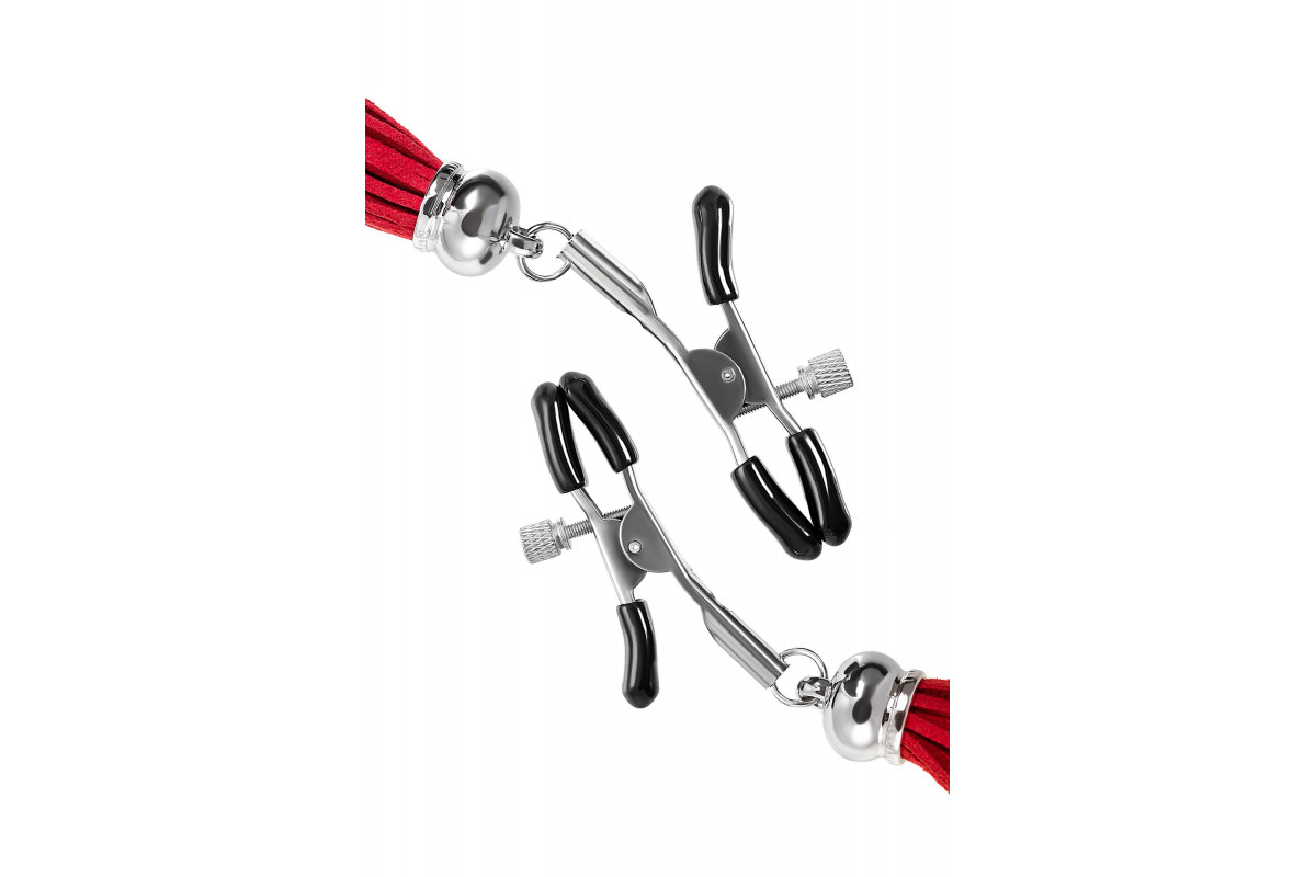 Особенностью этих зажимов является их изящный дизайн — яркие красные кисточки из замши создают эффект насыщенного цвета, который эффектно контрастирует с кожей. Эти кисточки не только придают зажимам эффектный внешний вид, но и обеспечивают комфортное ощущение во время использования, ведь замша мягкая и приятная, не травмирующая чувствительную кожу. Благодаря удачному балансу между эстетическими и тактильными качествами, зажимы превращаются в одновременно привлекательный и функциональный предмет для эротических игр.