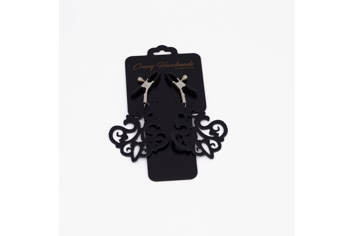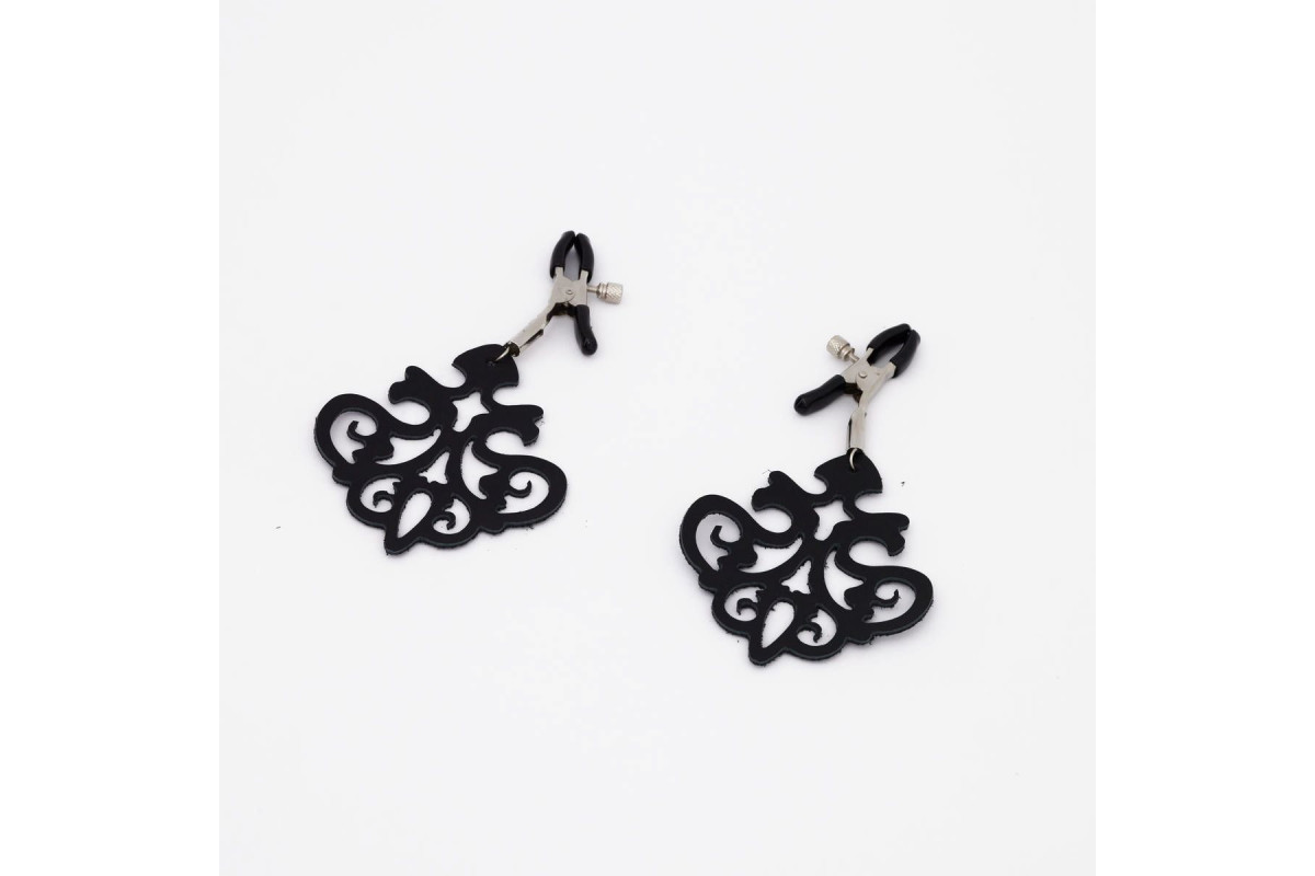 Зажимы оснащены мягкими резиновыми наконечниками , которые обеспечивают комфортное сжатие сосков, не вызывая дискомфорта. При этом кожаные резные наконечники добавляют изделию элегантности и создают приятные тактильные ощущения на коже. Сила сжатия регулируется с помощью подвижного колечка на зубцах , что позволяет настроить интенсивность воздействия под свои предпочтения.