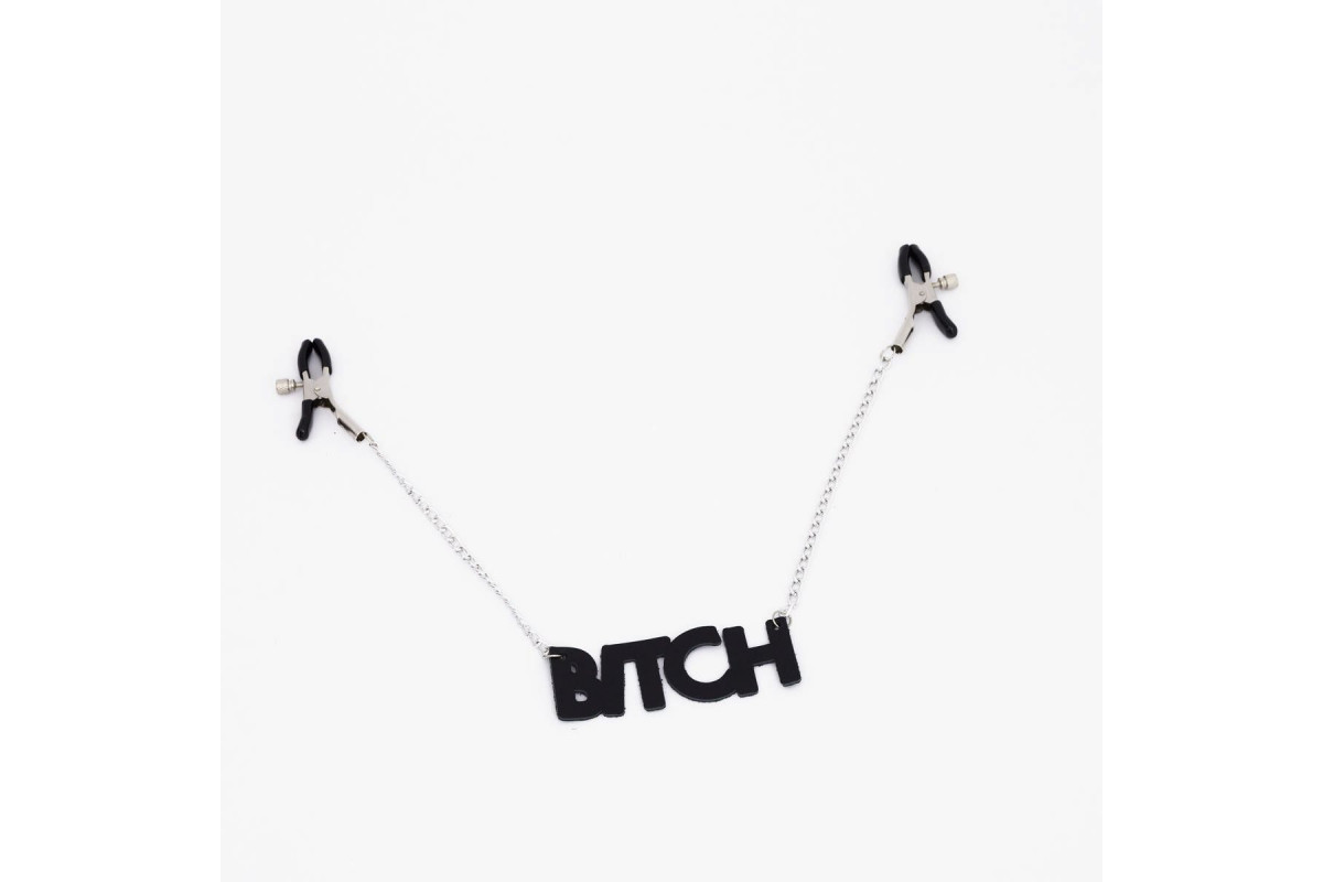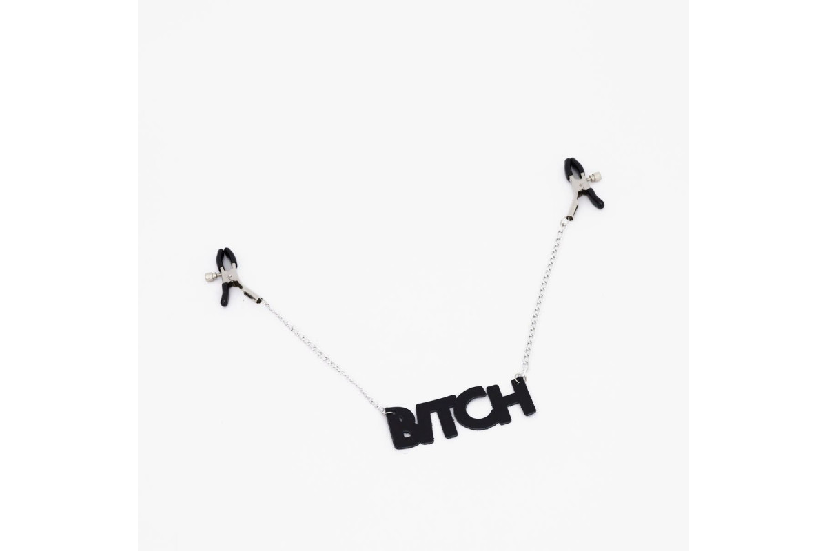 Зажимы оснащены мягкими резиновыми наконечниками , которые обеспечивают комфортное сжатие сосков, не травмируя кожу. Между собой зажимы соединены металлической цепочкой , на которой эффектно расположена надпись BITCH , добавляющая изделию игривости и интриги. Сила сжатия регулируется с помощью подвижного колечка на зубцах , что позволяет настроить интенсивность воздействия под свои предпочтения.