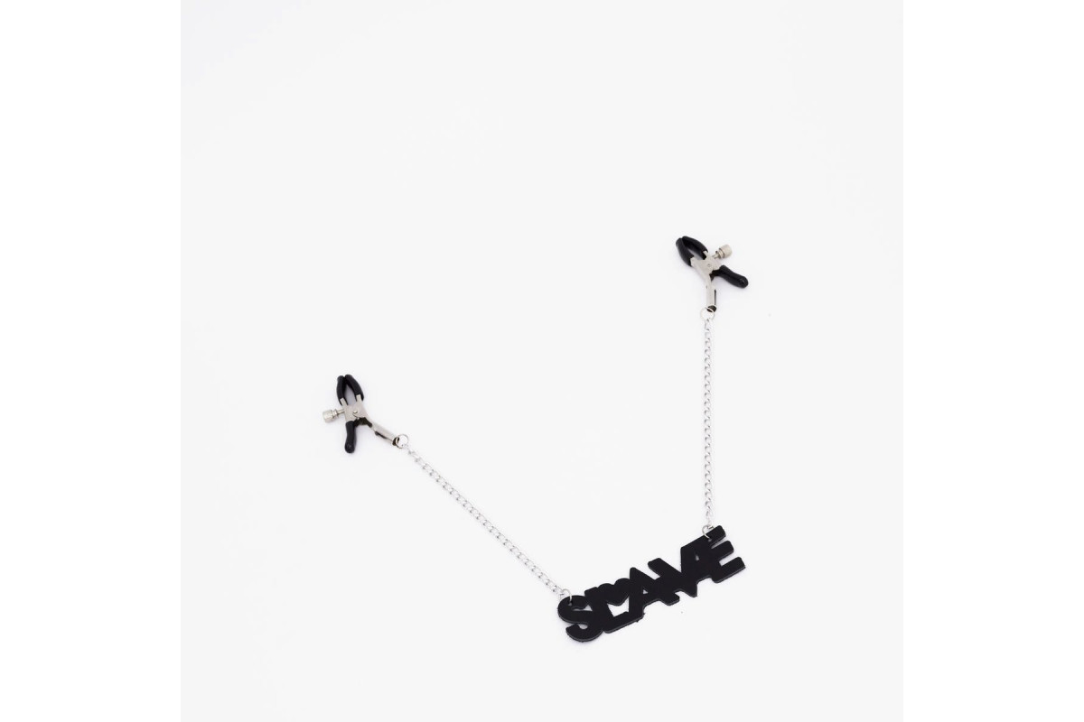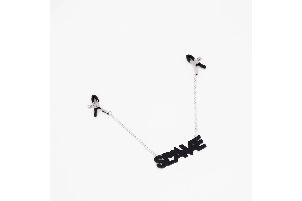 Зажимы оснащены мягкими резиновыми наконечниками , которые обеспечивают комфортное сжатие сосков, не травмируя кожу. Между собой зажимы соединены металлической цепочкой , на которой эффектно расположена надпись SLAVE , добавляющая изделию игривости и интриги. Сила сжатия регулируется с помощью подвижного колечка на зубцах , что позволяет настроить интенсивность воздействия под свои предпочтения.