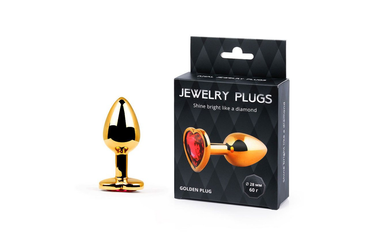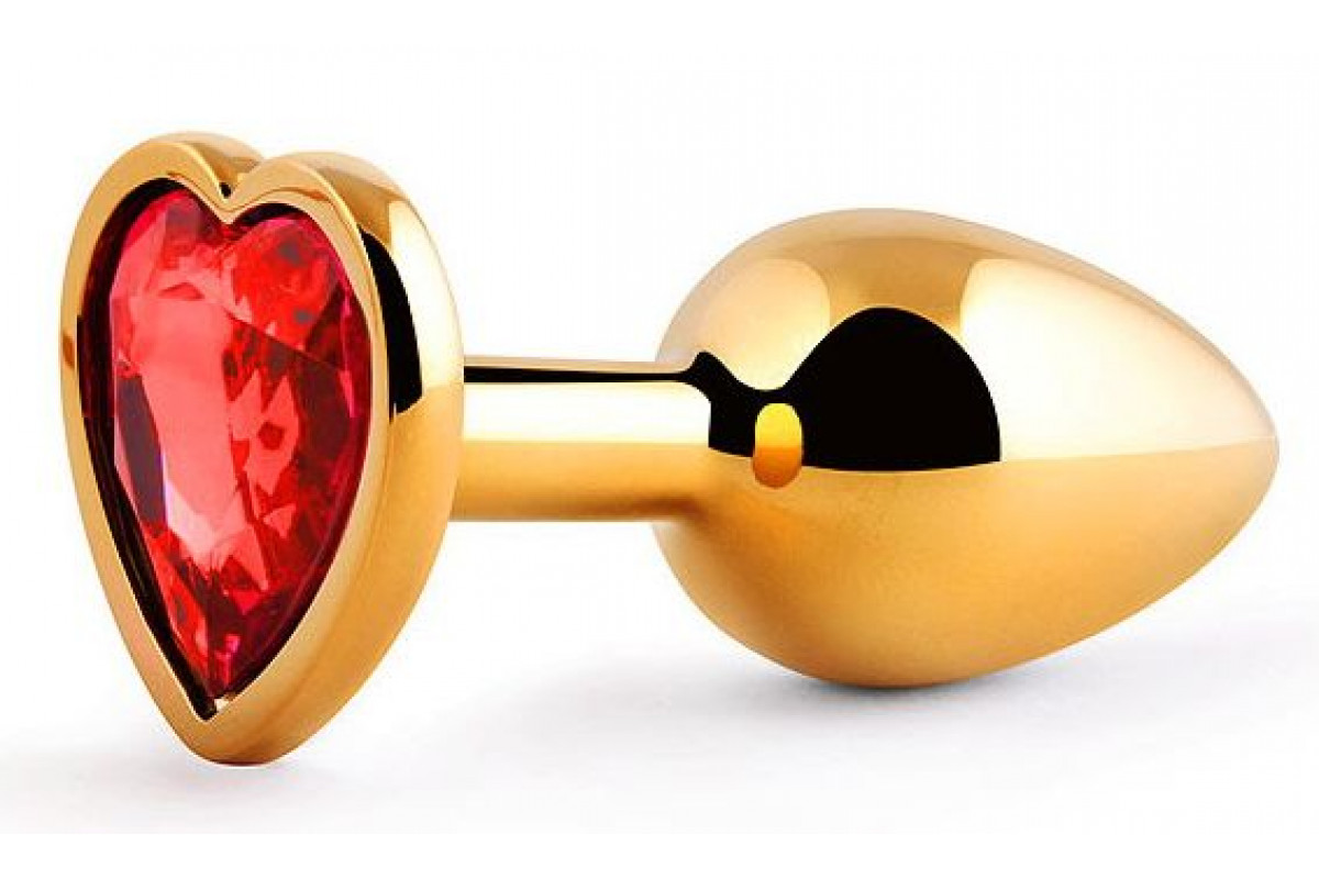 Золотистая анальная пробка с красным стразом-сердечком - 7 см.