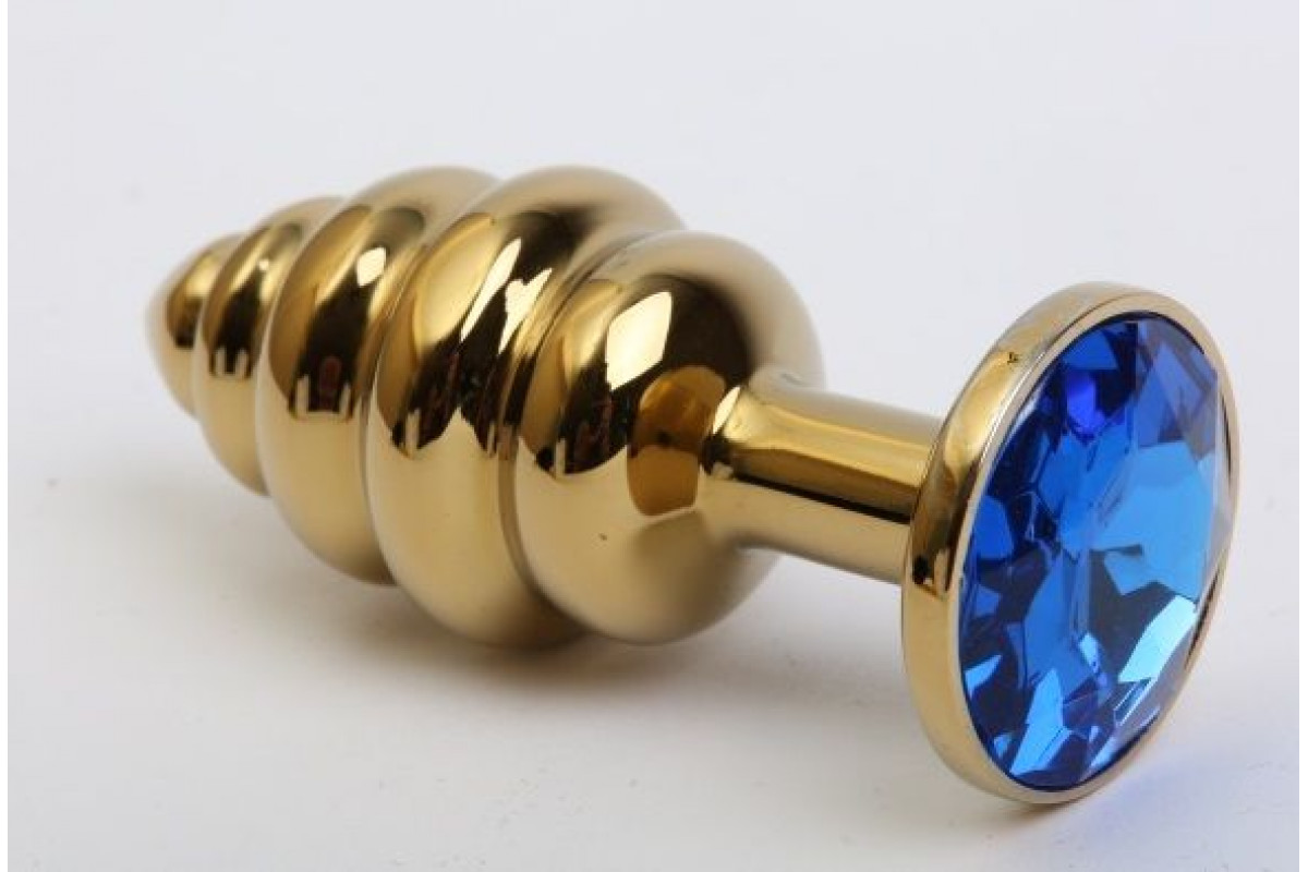 Элегантная золотистая рифлёная пробка с синим стразом — идеальный аксессуар для взрослых